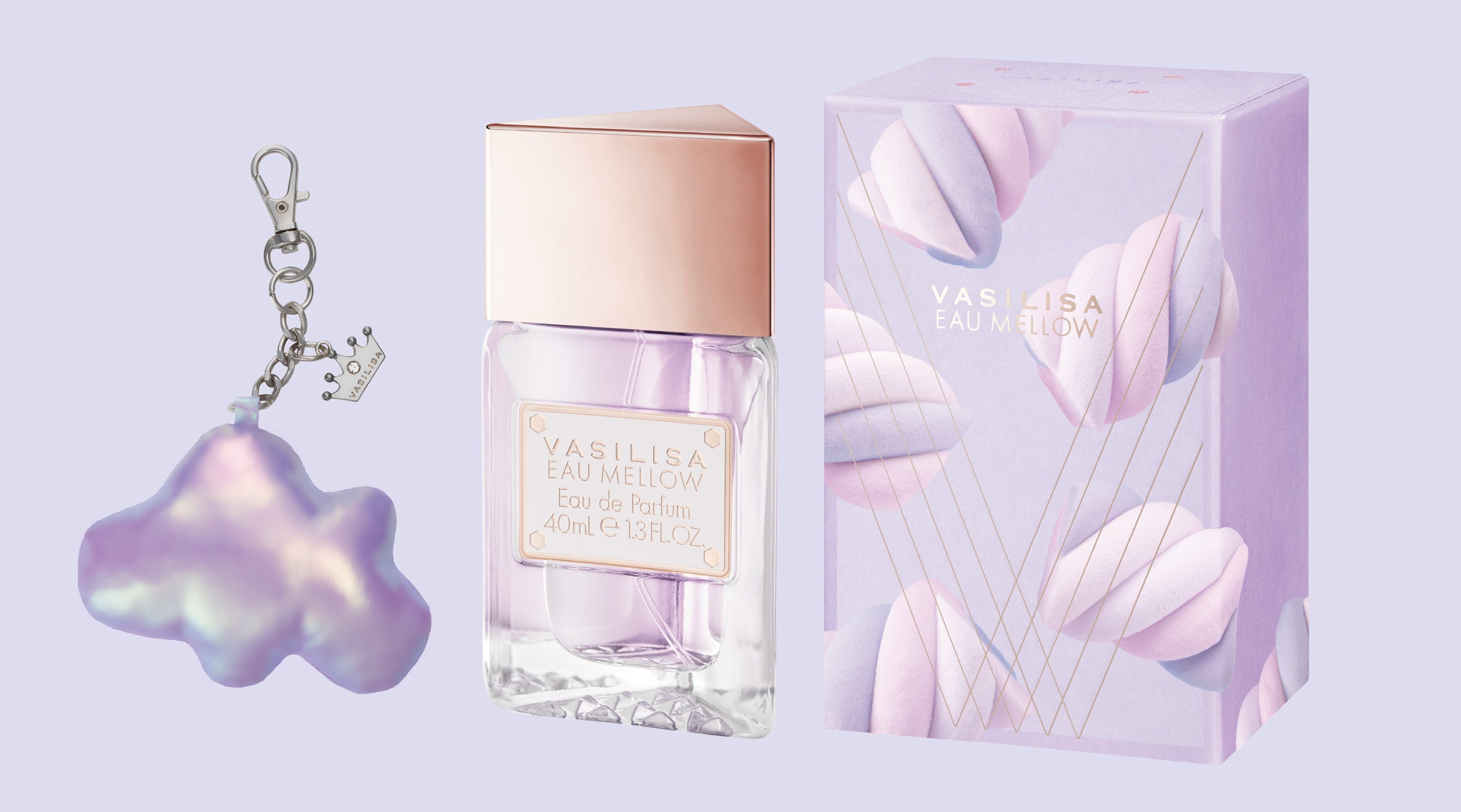 「オー メロウ」の発売を記念して、オリジナルチャーム付きの初回限定パッケージが登場。パッケージには、雲のように浮かぶマシュマロを大胆にデザインしました。付属のチャームは、キラキラとした雲型クッションに、VASILISAの刻印入り“女王の王冠”を添えた特別仕様です。