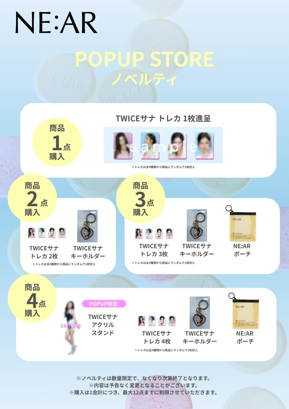 4点以上購入:POPUP限定 TWICEサナ アクリルスタンド+TWICEサナ キーホルダー+NE:AR ポーチ+TWICEサナ トレカ4枚