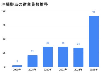 沖縄拠点は2020年4月の開設以来、国内最大級(※1)の配送プラットフォーム「ピックゴー」の基盤を支える重要な役割を担ってきており、地元出身者やUIターン希望者など、優秀な人材の採用を積極的に進めてきました。開設当初はオペレーション部門と開発部門の2部門体制でしたが、2024年10月の沖縄への本店移転に伴い、マーケティングやコーポレート部門など職種を拡大しました。その結果、従業員数は2021年末の21人から2025年末には91人にまで大幅に増加しました。また、サービスの企画・開発・改善を担うエンジニアの定着率も高い水準を維持しています。