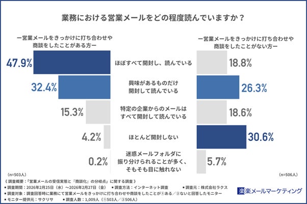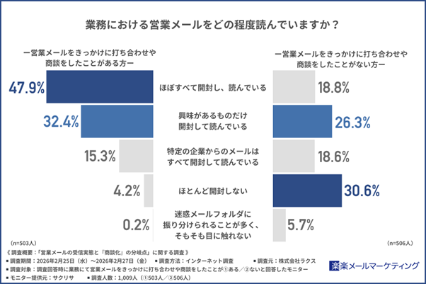 打ち合わせ・商談経験者の約半数が営業メールを「ほぼすべて読んでいる」、一方未経験者は約3割が「開封しない」。営業メールへの受容姿勢に明確な差
