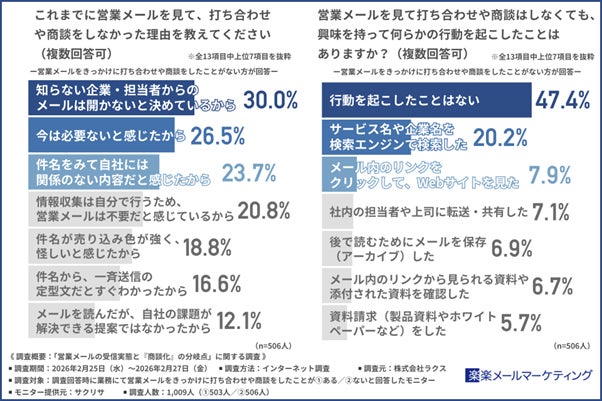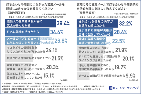 株式会社ラクス(本社所在地:東京都渋谷区、代表取締役:中村 崇則)が提供するメールマーケティングサービス「楽楽メールマーケティング」(旧名称:配配メール)は、業務にて営業メールをきっかけに打ち合わせや商談をしたことがある方とない方を対象に「営業メールの受信実態と『商談化』の分岐点」に関する調査を実施しました。