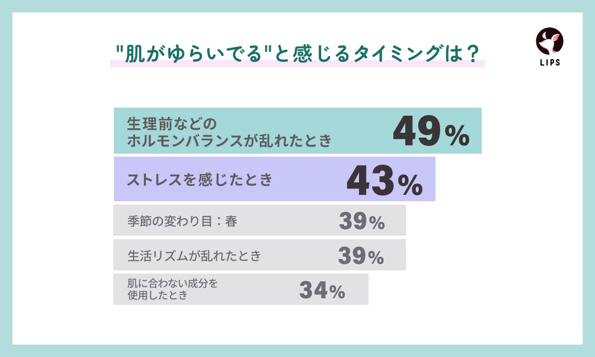 肌が敏感になりやすいタイミングについて聞くと、特に生理前やストレスを感じたときに肌がゆらぎやすいことが判明。ストレスや生活リズムの乱れだけでなく、春の花粉シーズンには肌が敏感になりひりつきを感じたり、敏感になりやすくなる人が多いようです。