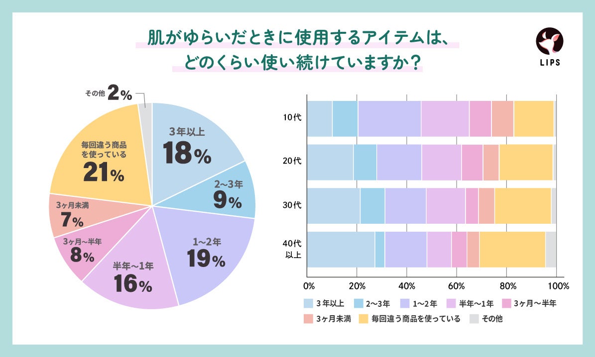 また、継続使用について聞いてみたところ「毎回違う商品を使っている」と回答した人の割合が21%ともっとも多い結果に。肌がゆらいだときのお守りアイテムに出合うべく、さまざまな商品を試している層が一定数いることがうかがえます。