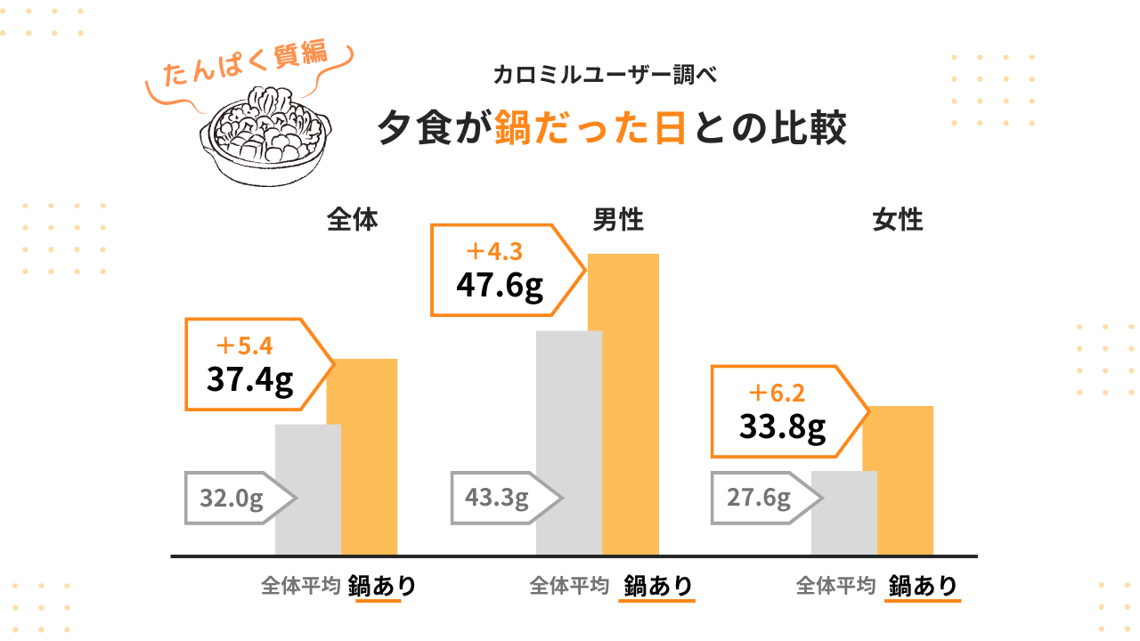 鍋料理を食べたカロミルユーザーの夕食の栄養バランスを調査した*2ところ、鍋料理を食べた夕食のたんぱく質が、全体平均で37.4gと普段よりも5.4g多く、また男性、女性共に1割以上多く摂取できていることがわかりました。鍋料理には、肉や魚の他、たんぱく質の豊富な豆腐や油揚げなどの大豆製品が入ることも多く、たんぱく質が