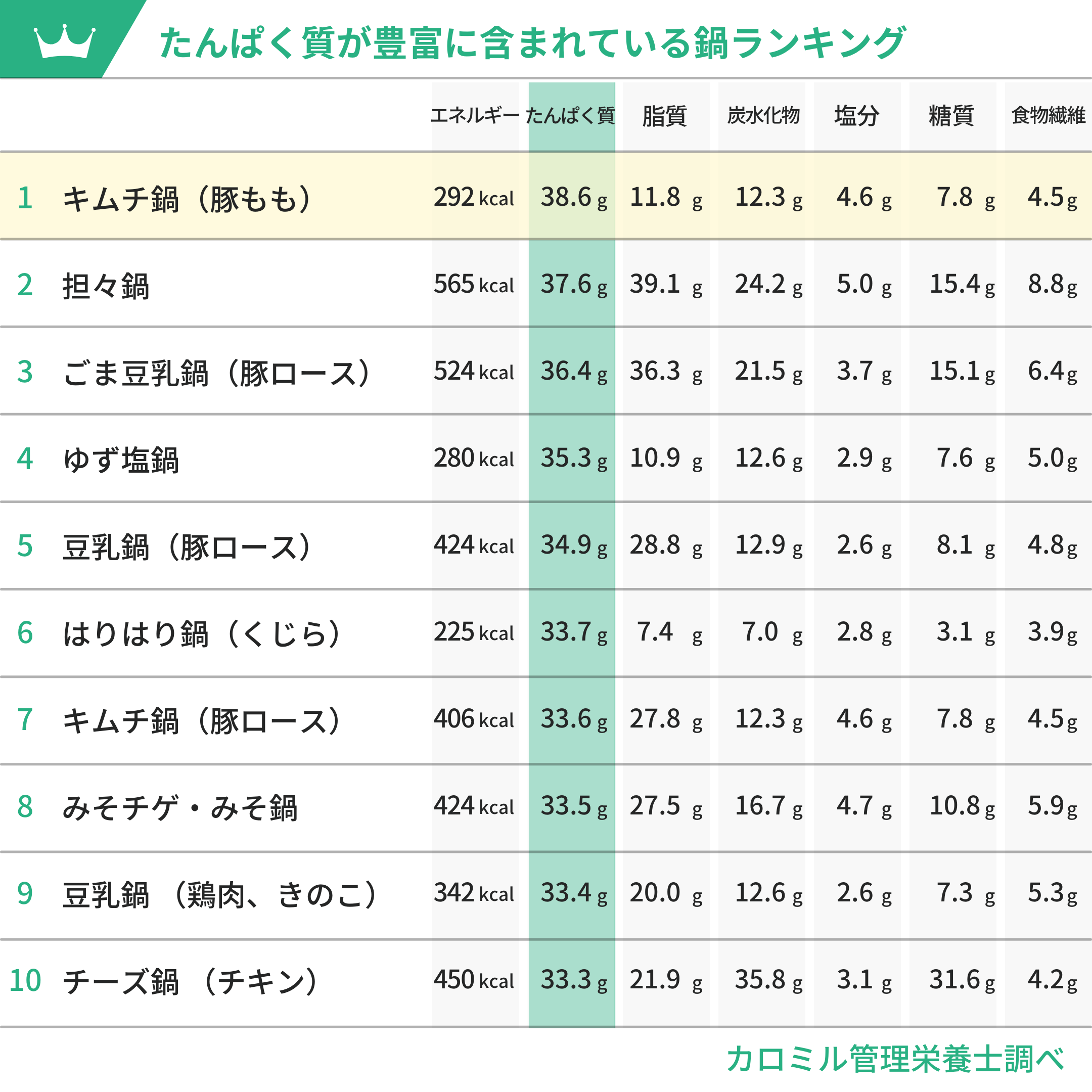 ④たんぱく質量1位の鍋は「キムチ鍋(豚もも)」、食物繊維量1位は「野菜のみぞれ鍋」 |