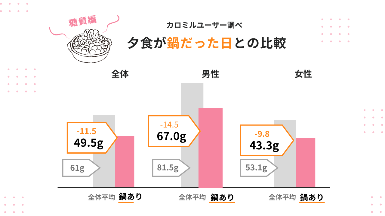鍋料理では、野菜がたっぷり入る傾向にあるため食物繊維の摂取量が増え、糖質の元となるご飯や麺類などの主食がは締めとして食べるため控えめになることが要因と考えられます。