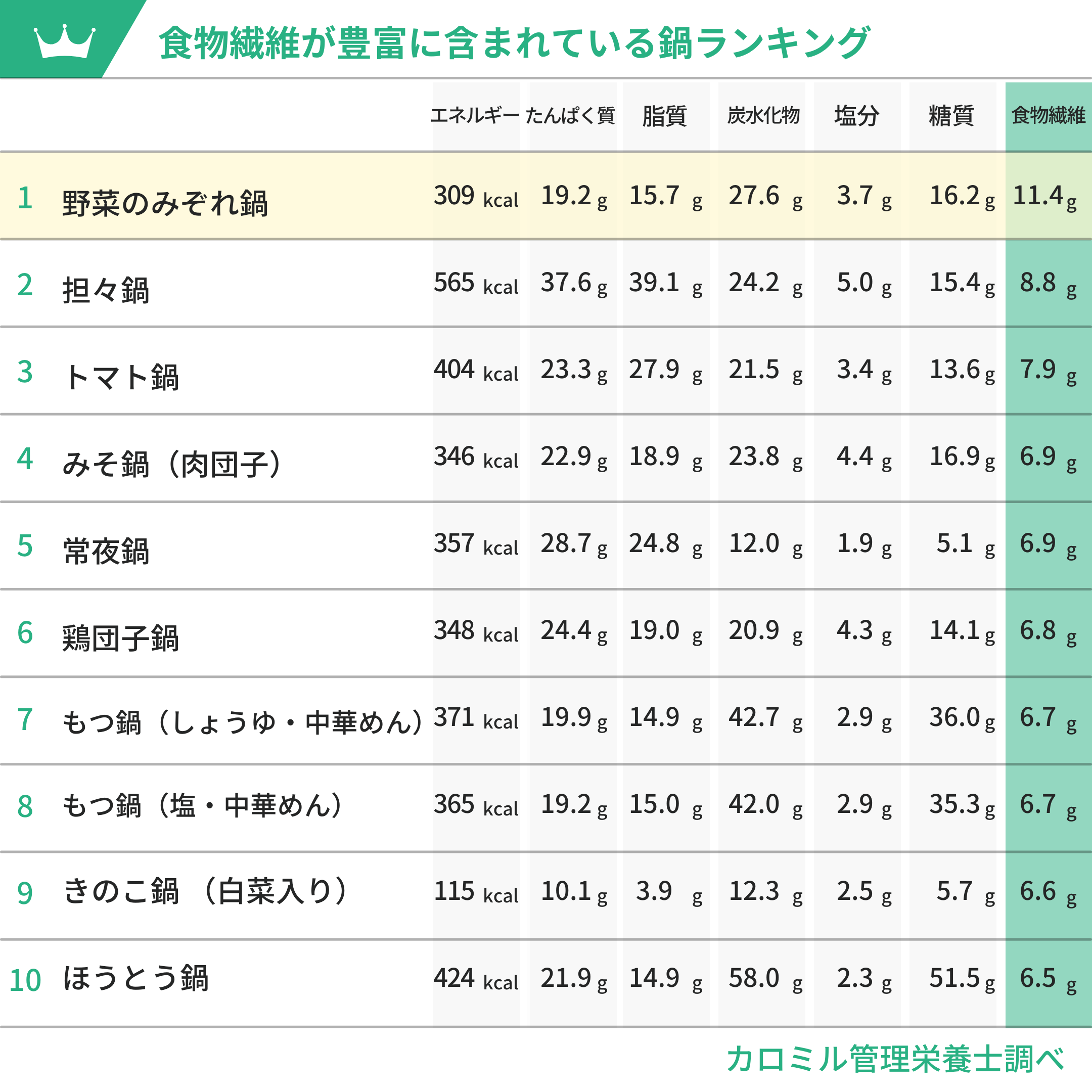 1位は、鳥つくねをメイン具材にキャベツやネギなどの野菜に大根おろしがたっぷりかかった「野菜のみぞれ鍋」がランクインしました。大根おろしなど水分が抜けた野菜は、食物繊維が豊富に含まれています。野菜やきのこ類には食物繊維が豊富に含まれていますので、野菜がメインの鍋や肉類が少なめの鍋が多くランクインしました。