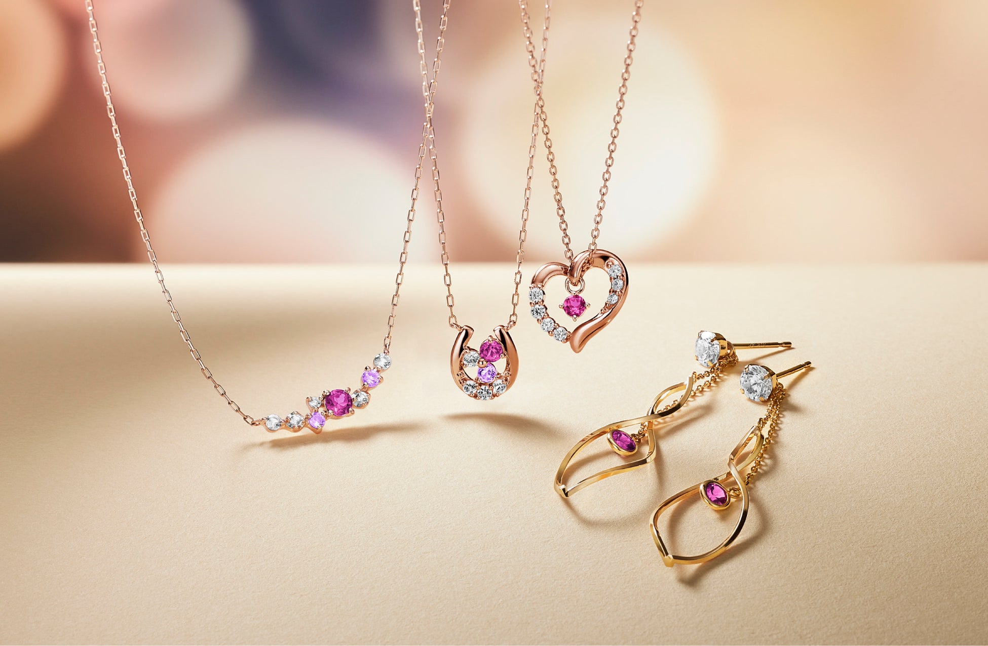 ポジティブな意味を持つラッキーモチーフに、ロードライトガーネットやピンクアメシストの春を先取りしたような色合いをプラス。新しい年の希望の光を受けて煌めく、一年の始まりにふさわしいジュエリーです。