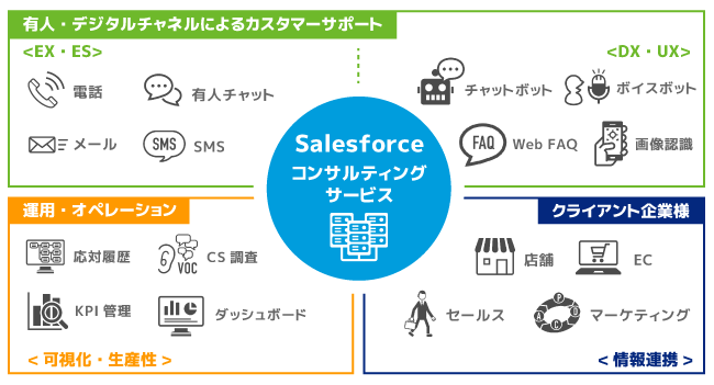 「Salesforce Service Cloud」の提供に当たって、システム単体のみならず、有人チャネルである電話や有人チャット、チャットボットやボイスボットのデジタルチャネルも、お客さまのニーズに合わせ提供いたします。