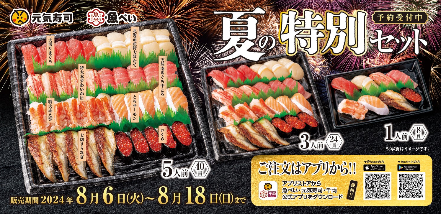 寿司レストランチェーンを展開する株式会社Genki Global Dining Concepts (本社:栃木県宇都宮市 代表取締役社長執行役員 東 光法)は、8月6日(火)から 8月18日(日)までの期間限定で、「天然南まぐろ中とろ」や「特大本ずわいがに」、肉厚の「北海道産特大ほたて」、「特大赤えび」をはじめとする豪華ネタ8種を詰め込んだ「夏の特別セット」をテイクアウト限定で販売いたします。また、1人前・3人前・5人前をご用意しておりますので、ご利用シーンにあわせてご注文いただけます。さらにアプリで予約すると事前決済で受け取りもスムーズです。現在ご予約を受付中です!是非おいしいお寿司を食べて楽しい時間をお過ごしください!