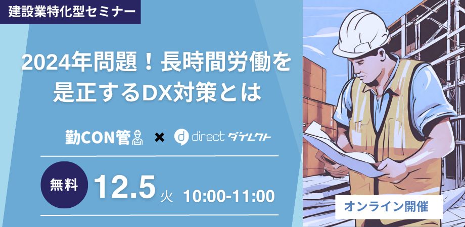 建設業界の2024年問題課題を解決するため、工事現場の勤怠管理に特化した勤怠管理クラウドサービス『勤CON管』を提供するあさかわシステムズ株式会社と、現場のコミュニケーションDX・業務効率化を実現するビジネスチャット『direct/ダイレクト』を提供する株式会社L is Bがタッグを組み、長時間労働を是正する建設業のDXについて解説する共催セミナーを開催いたします。
