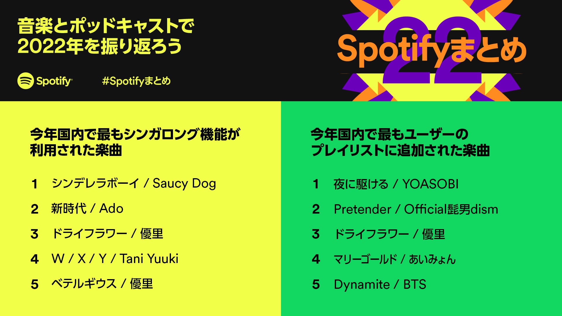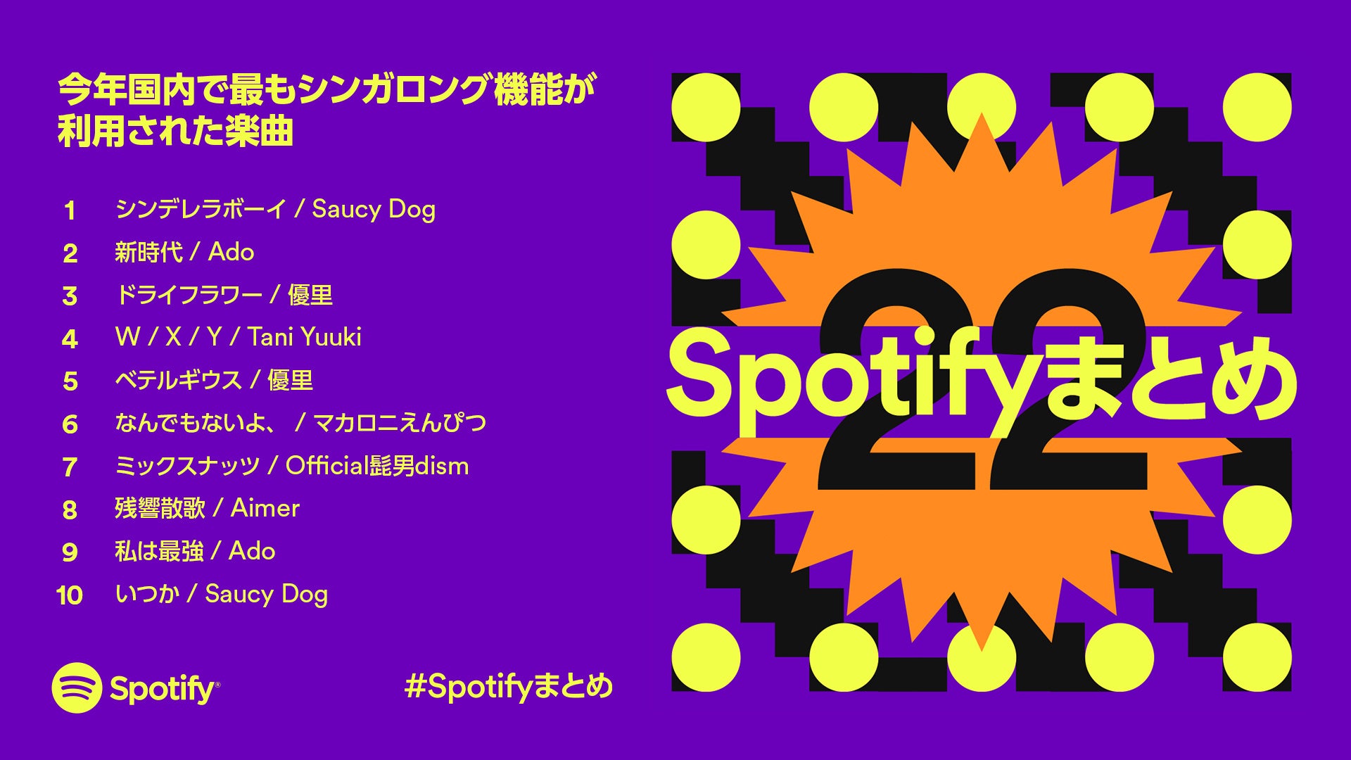 世界で4億5,600万人以上のユーザーが利用するオーディオストリーミングサービスSpotify(会社名 Spotify A B / 本社 Stockholm, Sweden)は、この度、Spotify上でのリスニングデータを元に、ボーカル音量を調整してアーティストと一緒に歌って楽しめる「シンガロング」機能を利用して今年国内で最もアーティストと一緒に歌われた曲を発表いたしました。また、世界と国内のユーザーが自身で作成したプレイリストに今年最も追加した曲のランキングもあわせて発表いたしました。