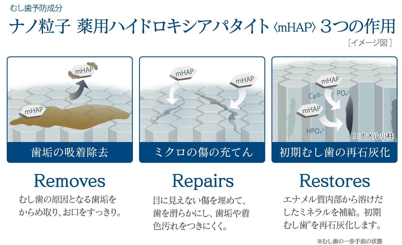 *3 薬用ハイドロキシアパタイトは、溶け出した歯の主成分を補給(歯の表面のミクロの傷を修復、むし歯の一歩手前の初期むし歯を再石灰化)し、歯垢を吸着除去することで、むし歯を予防します。