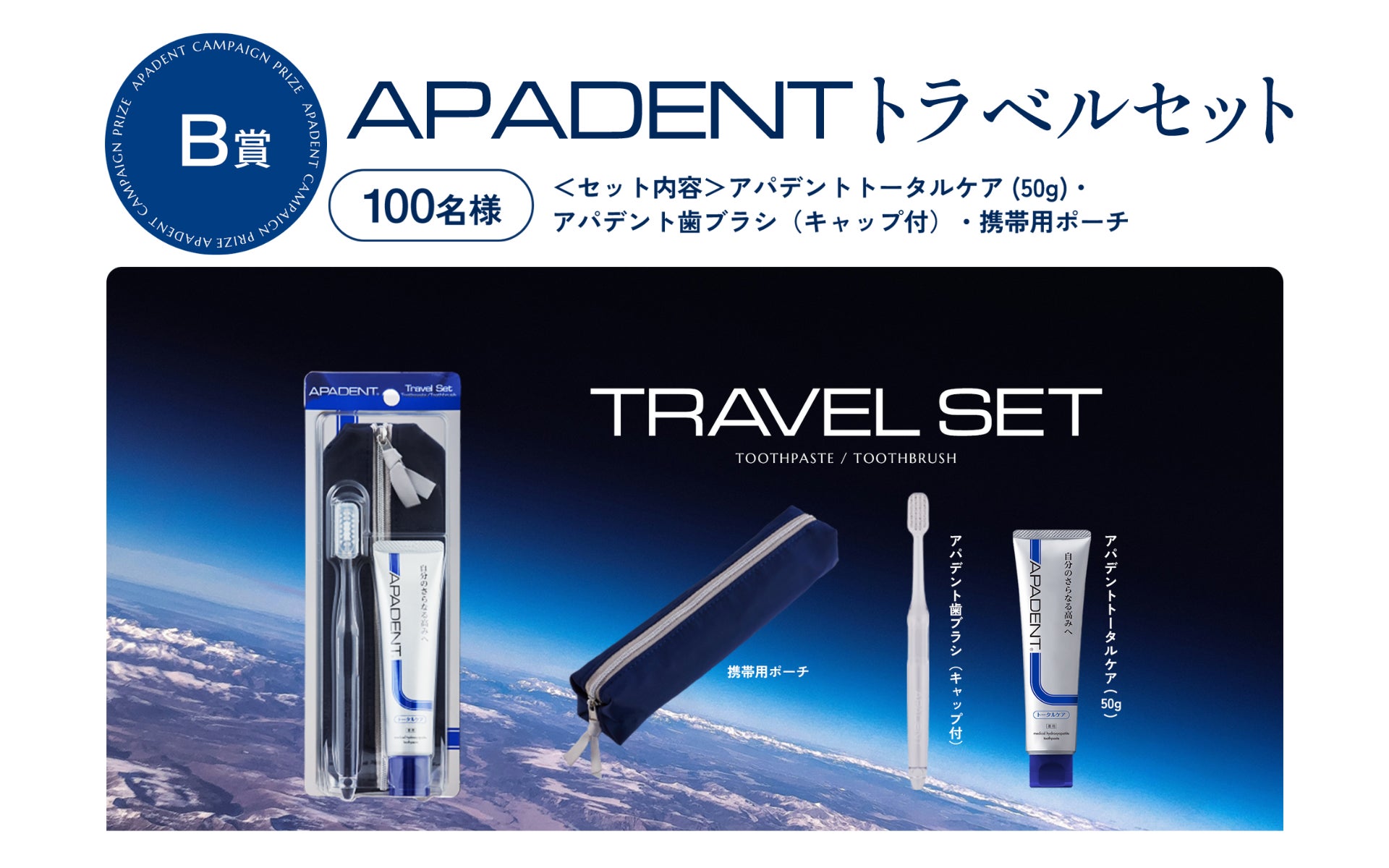 アパデントがNASAのアイデアをヒントに誕生したことから、A賞は「ケネディスペースセンターツアー」を2組4名様にプレゼント。B賞は「アパデント トラベルセット」が100名様に当たります。賞品はA賞のみ・B賞のみ・A賞B賞両方の3つの選択肢の中から選んでご応募いただけます。