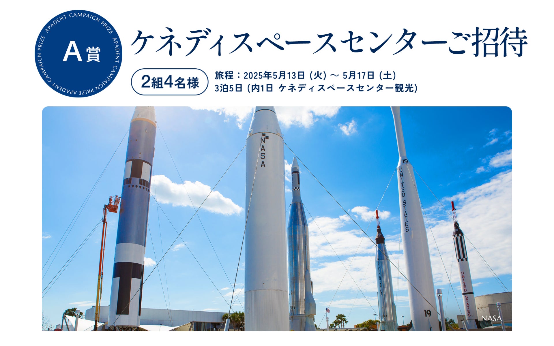 A賞 ケネディスペースセンターツアー / 2組4名様 (旅行時期:2025年5月13日~17日) B賞 アパデント トラベルセット / 100名様 ●賞品はA賞のみ・B賞のみ・A賞B賞両方の3つの選択肢の中から 選んでご応募可能です。 |