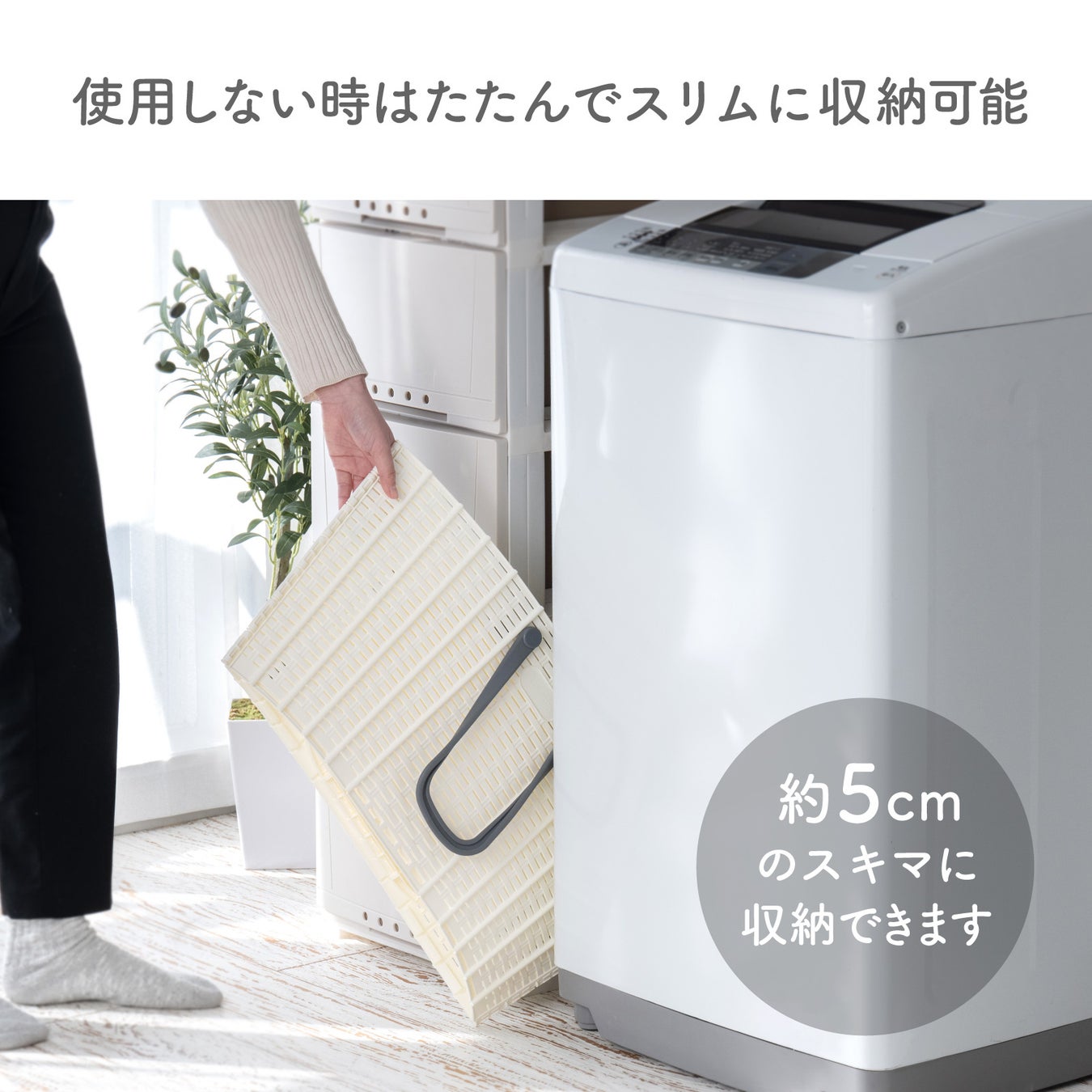 使用後はスリムにたたんで洗濯機横などの隙間にサッとしまえます。洗面所などの狭い空間でも置き場や収納に困りません。