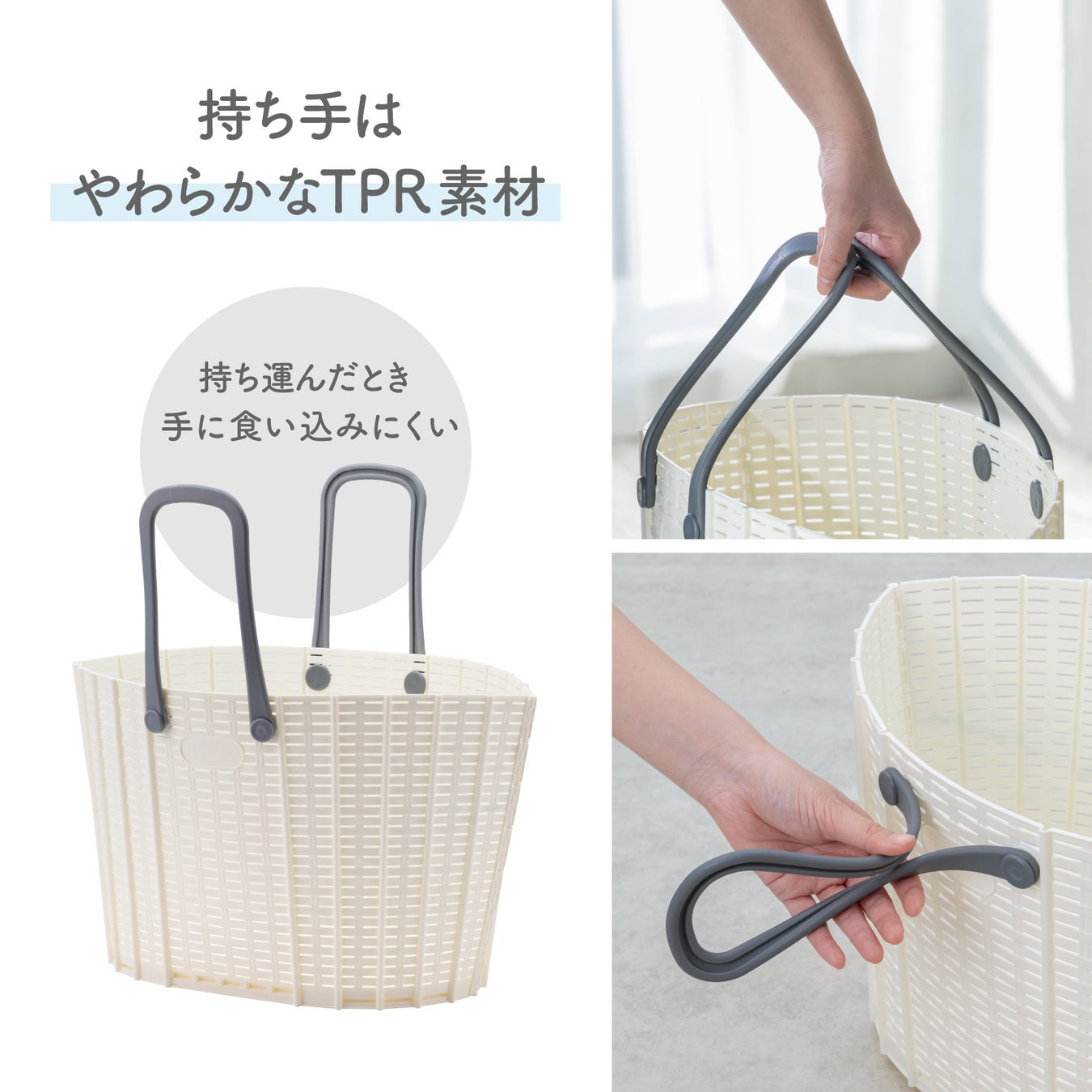 長さ19cmのやわらかな持ち手はTPR素材で手にやさしく食い込みにくいので、片手でも持ち運びしやすくなっています。