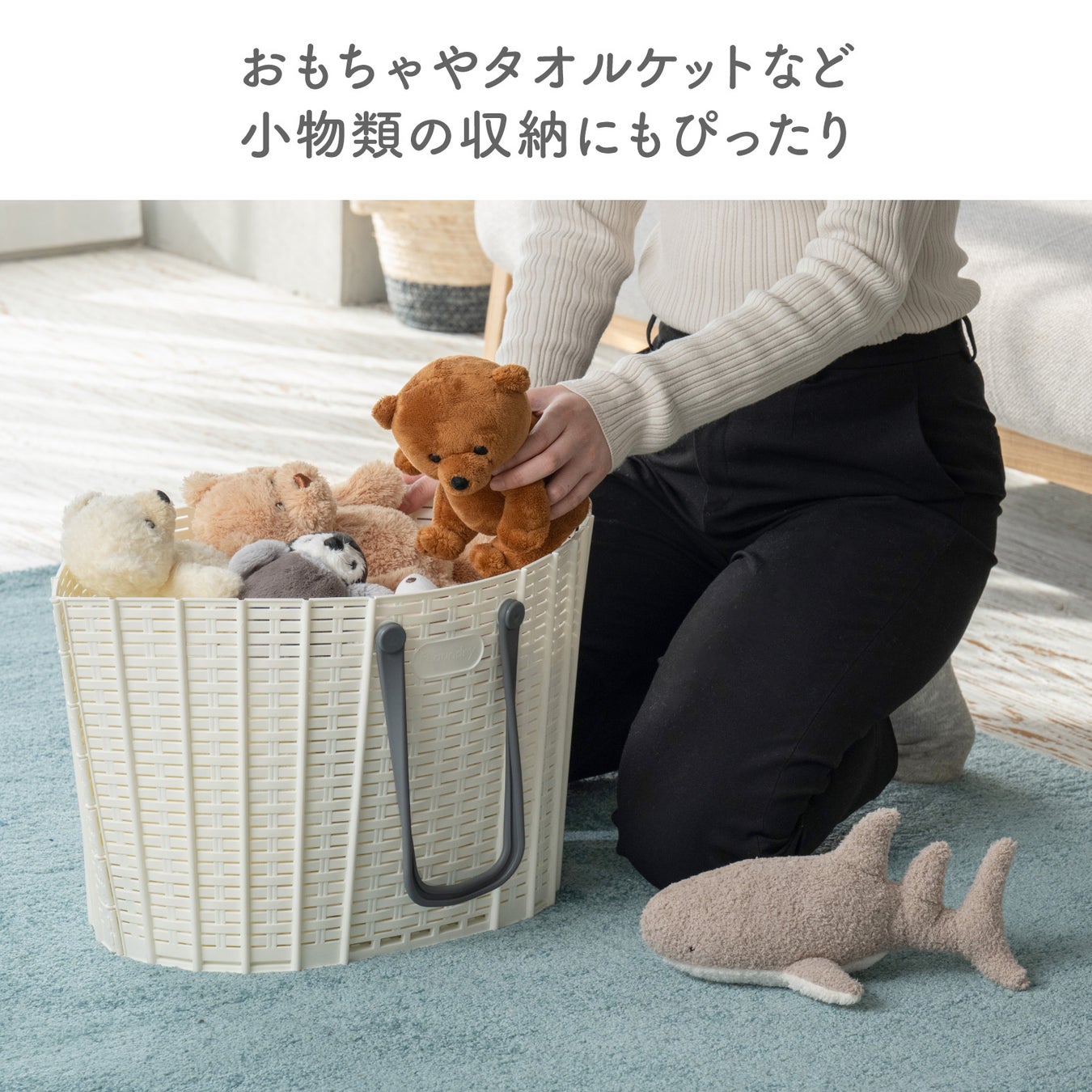 約4人分の洗濯物を収納できます。ランドリーグッズ、おもちゃや小物、お買い物やアウトドアなど外出時の荷物入れとしても便利です。