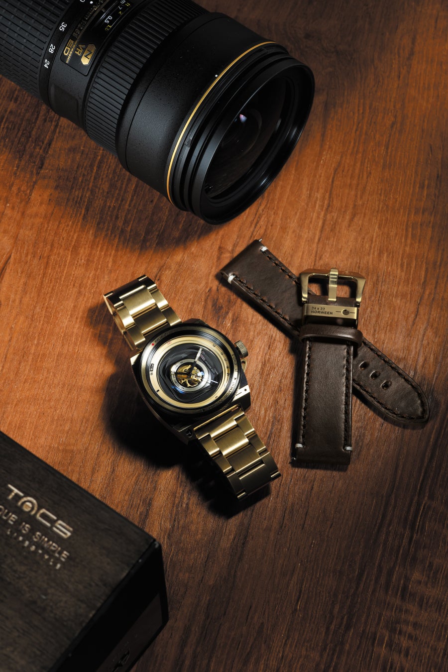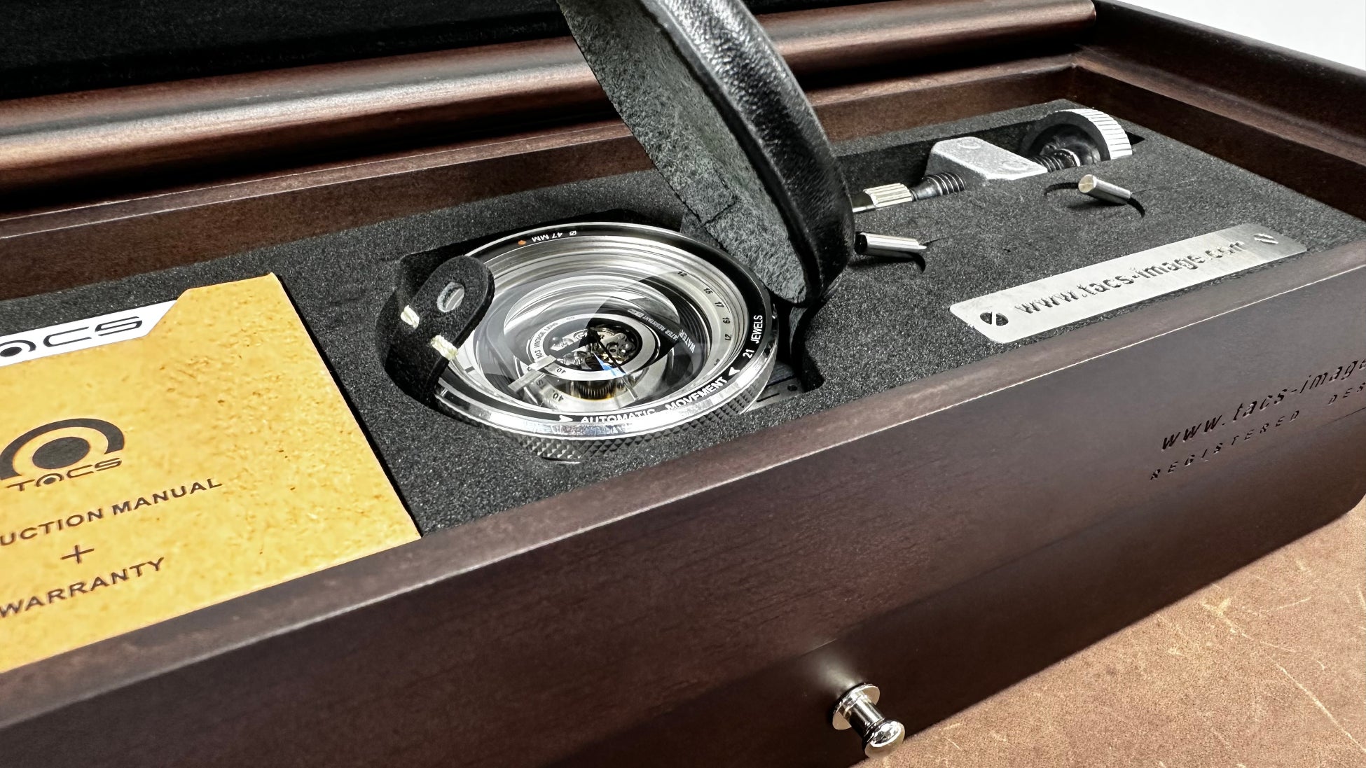 コレクター心をくすぐる、特別なひと箱。 AVL II ボックスセットは、カメラから着想を得た自動巻き腕時計に加え、レザーとメタルの2種類のストラップ、メタルストラップのコマ詰めができる専用ツール、保証カード、そして高級感あふれる木製ボックスがセットになったスペシャルエディション。