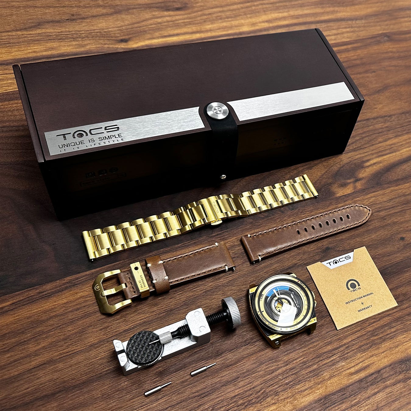 本モデルには、創業100年以上の歴史を誇る老舗タンナー「ホーウィン社」製のプルアップレザーを使用したストラップと、重厚感と高級感を兼ね備えたIP加工のメタルベルトを同梱。どちらのストラップも自分で簡単に外せる仕組みで、工具を使わず簡単に付け替えが可能。気分やシーンに合わせて、自由にスタイルを楽しめます。さらに、付属のウォッチプロテクターにもホーウィンレザーを採用し、細部にまでこだわりが光ります。