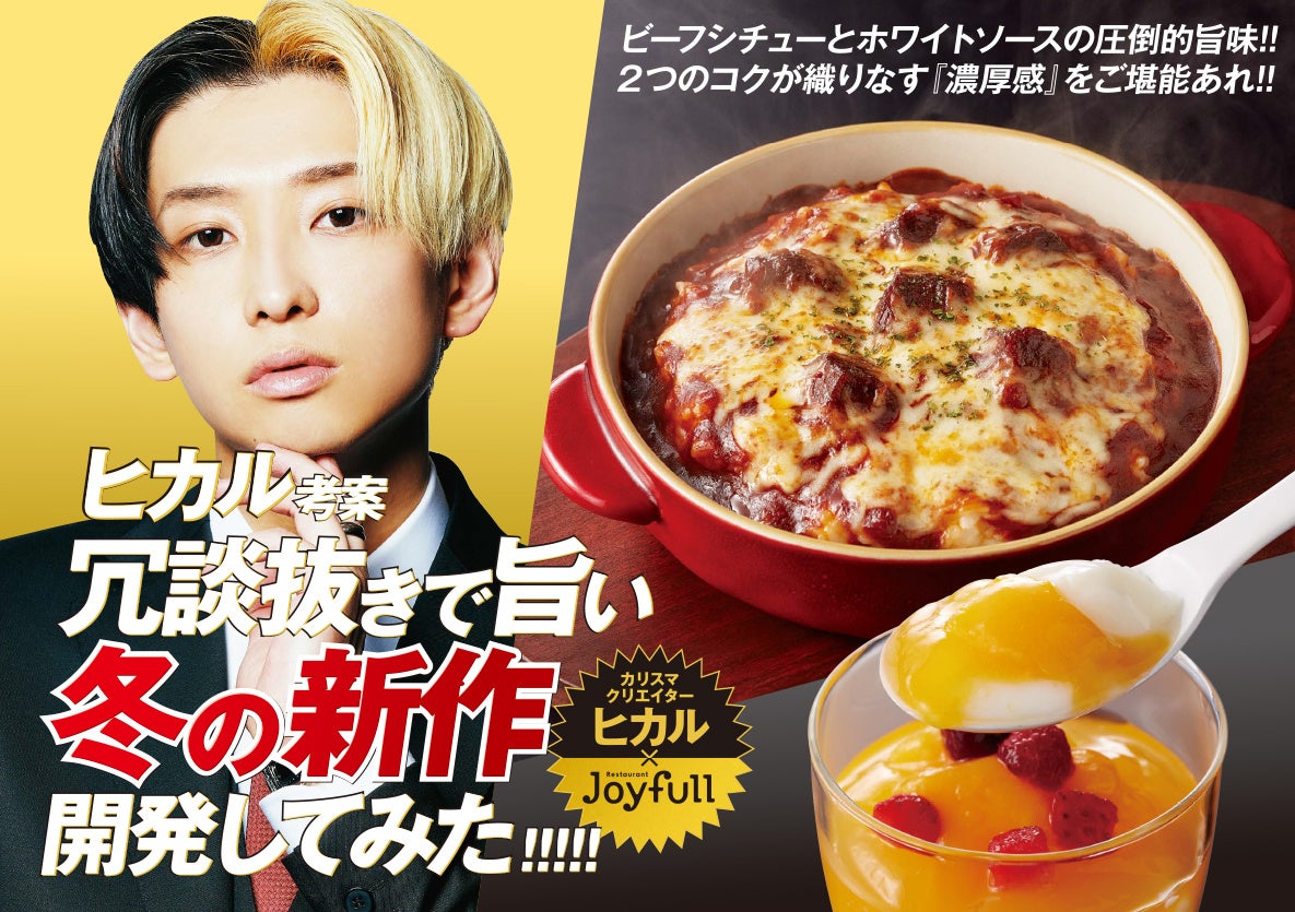 このたびジョイフルでは、当社アンバサダー・ヒカルさんとのコラボレーション商品第5弾「ヒカル考案 冗談抜きで旨い冬の新作」として「ヒカル考案 冗談抜きで旨いビーフシチュードリア」と「ヒカル考案 冗談抜きで旨いフルーツ杏仁豆腐」を12月6日(火)15時よりジョイフル全店にて販売いたします。