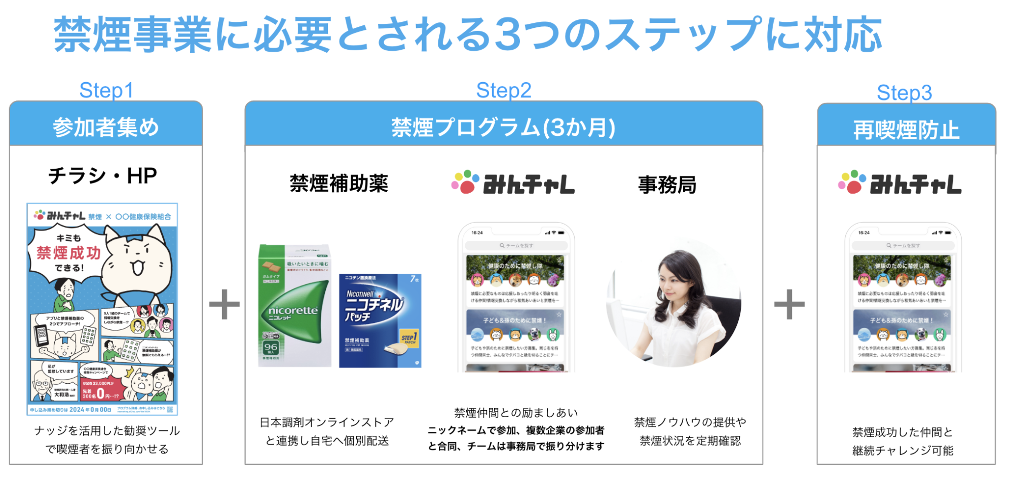 本プランでは、3社以上のグループで「みんチャレ禁煙」に参加することで、準備費用を抑えて導入いただけます。