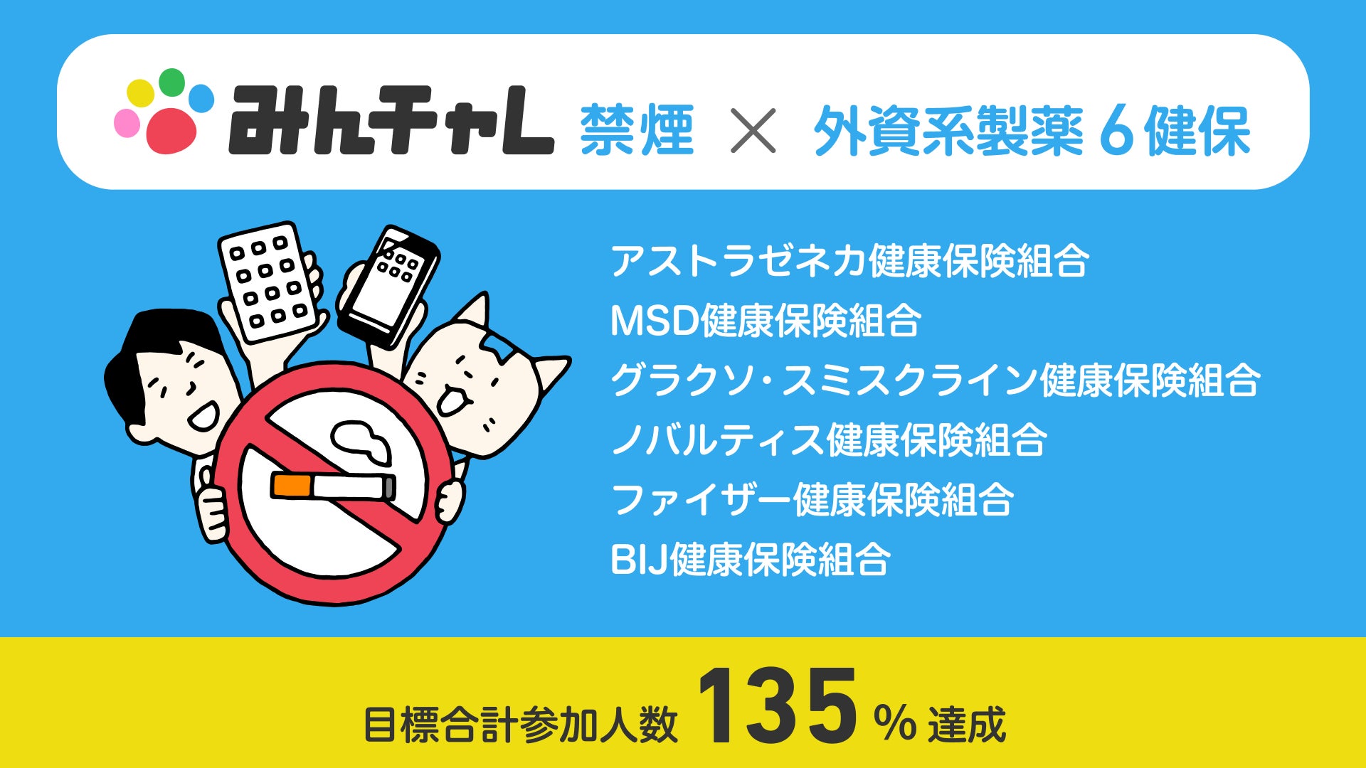 禁煙プログラム「みんチャレ禁煙」を開発・運営するエーテンラボ株式会社(本社:東京都中央区、代表取締役:長坂 剛)は、グラクソ・スミスクライン健康保険組合およびファイザー健康保険組合を含む、外資系製薬企業6健康保険組合の連絡会である戊子会(以下:戊子会)が「みんチャレ禁煙」に合同参加し、目標の合計参加人数の135%を達成したことをお知らせいたします。