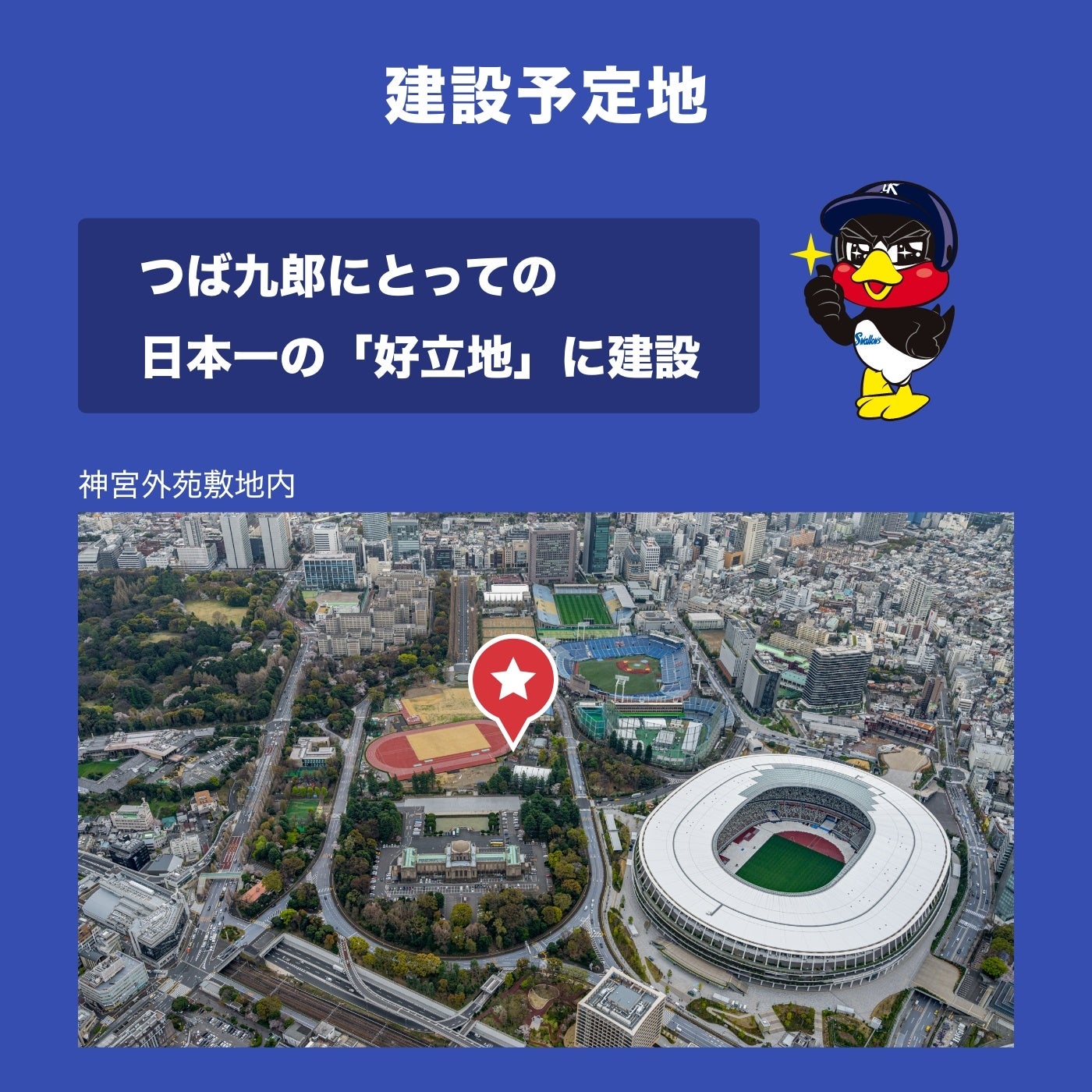 「好立地に家を建てる」ことに関しては日本一を自負している当社だからこそ、生半可な土地ではいけないと候補地探しに奔走いたし、ついにつば九郎にとってこれ以上ない好立地である明治神宮外苑の敷地内、スワローズOfficial Goods Shop つば九郎店の正面に建設可能な土地を確保するに至りました。