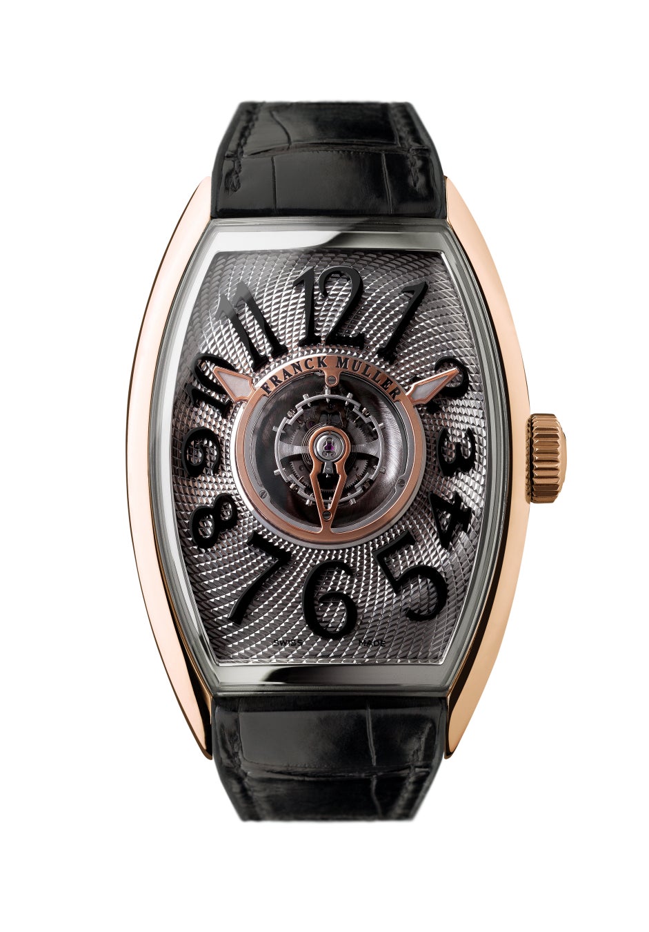 フランク ミュラーはこのモデルで初めて、トゥールビヨン機構を時計の中心に位置させました。またフランク ミュラーでは珍しい自動巻を採用したのですが、マイクロローター式の自動巻トゥールビヨンは極めて貴重な作品となっています。ケージ径17.7mmの堂々たるトゥールビヨンは、場所もサイズもこの時計の間違いない主役です。時刻表示はその外周から先端を突き出す時針・分針で示されますが、針を支持する中心にあたるものは見えません。ミステリアスなこの表示機構は、針を支える円形の部品をセラミックボールベアリングで支持して回転させる、画期的な新機軸です。
