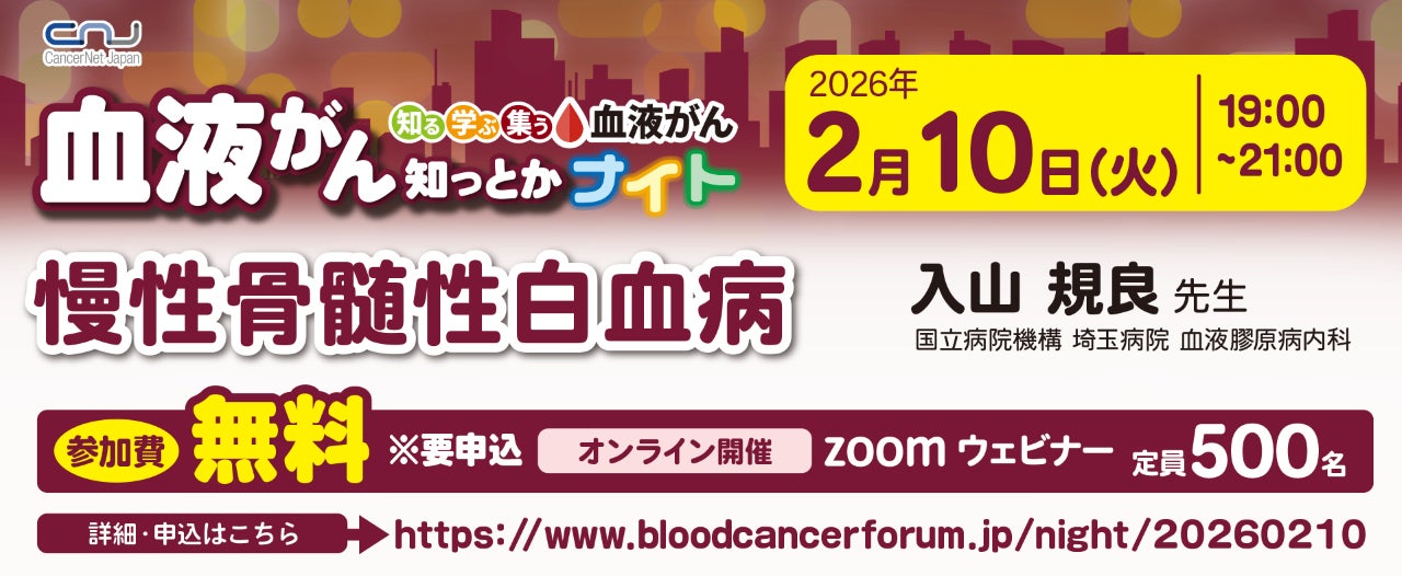 認定NPO法人キャンサーネットジャパン(東京都文京区 理事長 岩瀨哲)は、血液がんに関するオンラインセミナー「血液がん知っとかナイト」を開催しており、24回目の開催となる2026年2月は「慢性骨髄性白血病」をテーマに開催する運びとなりました。