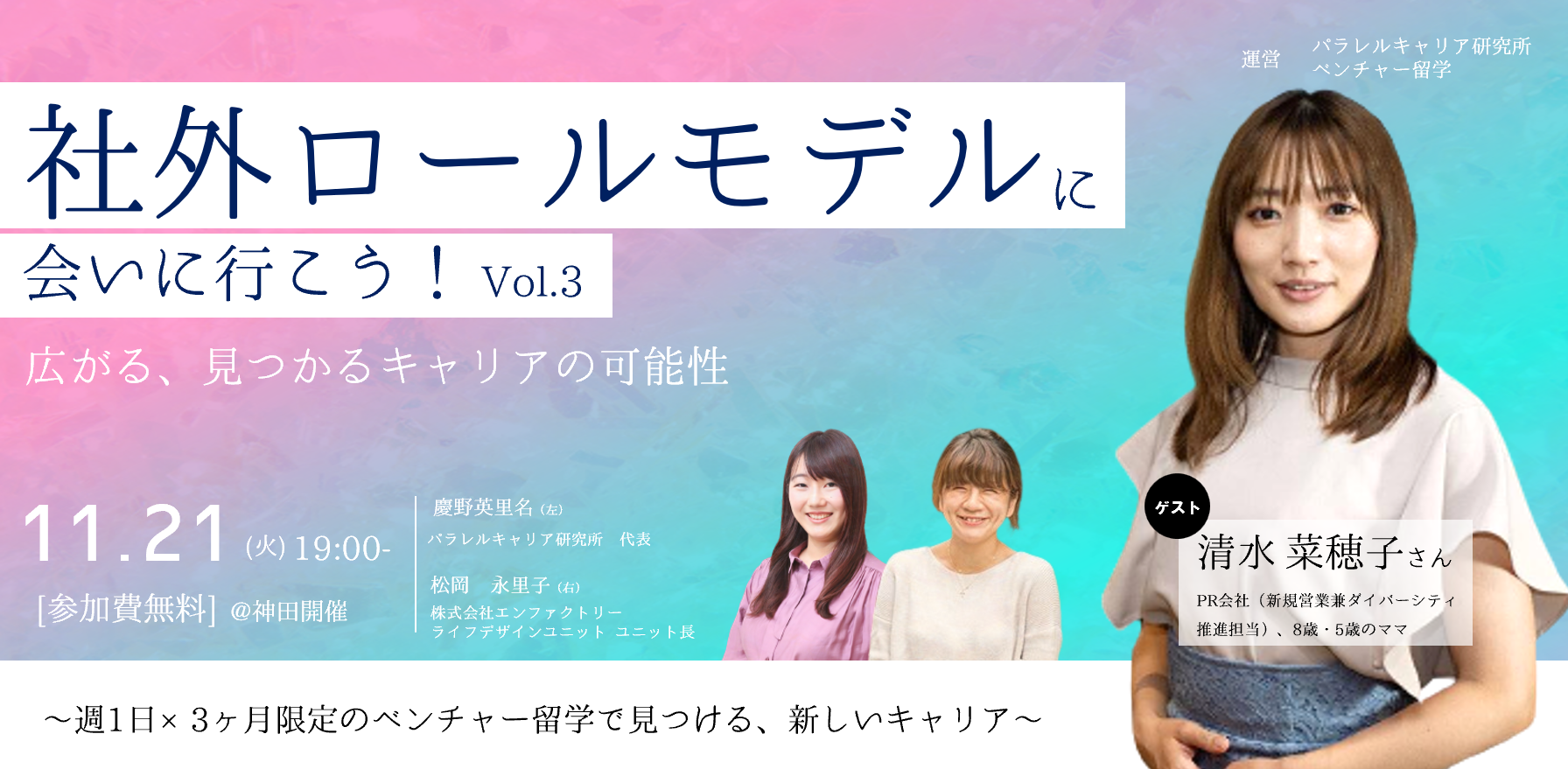 11月21日(火)19:00-21:00に、「社外ロールモデルに会いに行こう!Vol.3 広がる、見つかるキャリアの可能性~週1日×3ヶ月限定のベンチャー留学で見つける、新しいキャリア~」を開催します。