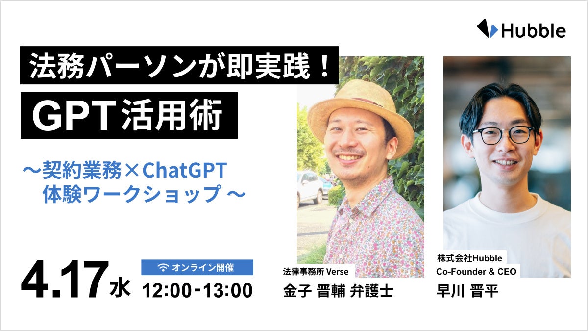 法務と事業部門の協業性を高め、盤石で生産性の高い業務基盤を実現する契約業務クラウドサービス「Hubble(ハブル)」を提供する株式会社Hubble(東京都渋谷区、CEO:早川晋平)は、2024年4月17日(水)12:00-13:00にて、日々ChatGPTを活用している法律事務所Verse 弁護士 金子 晋輔 氏をお迎えし、「法務パーソンが即実践!GPT活用術~契約業務×ChatGPT 体験ワークショップ~」と題した体験型セミナー/ワークショップを開催いたします。本セミナーは事前登録制・オンライン配信です。