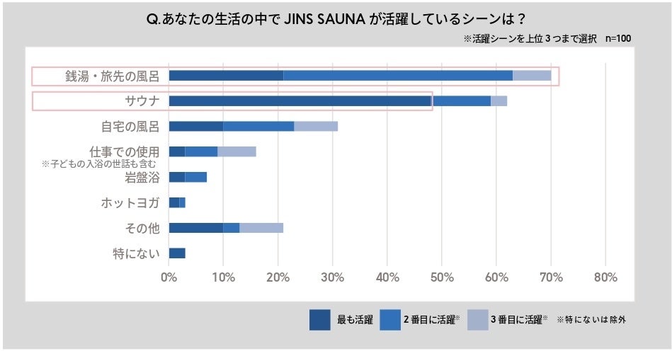 活躍シーン1位は「銭湯・旅先の風呂」70%、2位「サウナ」62%を上回る