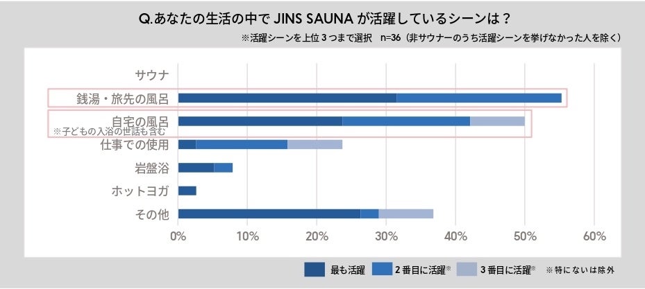 活躍シーンに「サウナ」を挙げた人をサウナーと仮定し、全ユーザーをサウナー、非サウナーで分類すると38%の人は非サウナーという結果に。「JINS SAUNA」は、非サウナーにも購入されていることが明らかになりました。それでは、非サウナーはなぜJINS SAUNAを使っているのでしょうか。非サウナーが挙げた「JINS SAUNA」の活躍シーンを見ていきましょう。