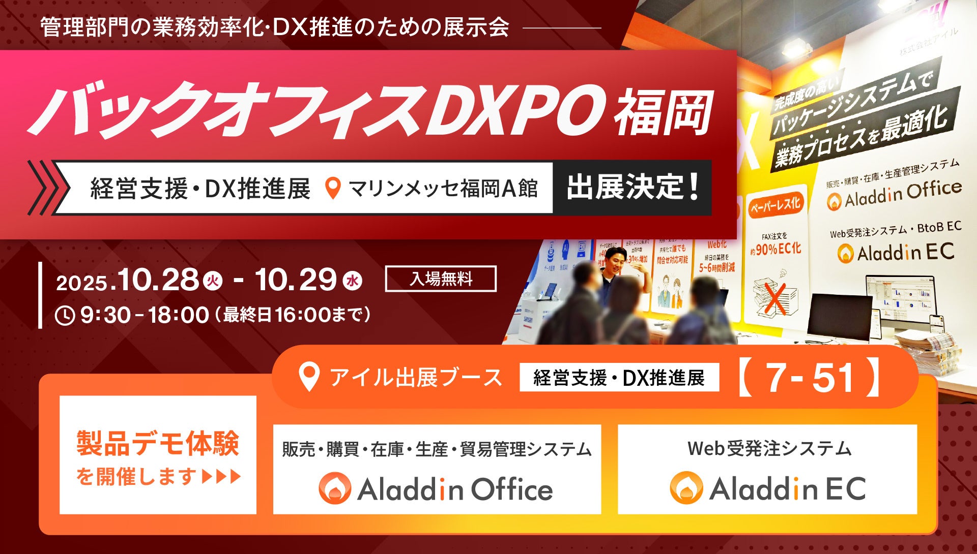 自社開発の業務管理システムで、企業のデジタル化推進と経営力向上を支援する株式会社アイル(本社:大阪市北区・東京都港区、代表取締役社長:岩本哲夫、東証プライム:3854)は、2025年10月28日(火)・29日(水)にマリンメッセ福岡にて開催される、管理部門のDX推進のための展示会「バックオフィスDXPO 福岡’25」に、販売・在庫・生産管理システム「アラジンオフィス」とWeb受発注システム「アラジンEC」を出展します。九州地区での大型展示会への出展は今回が初となります。