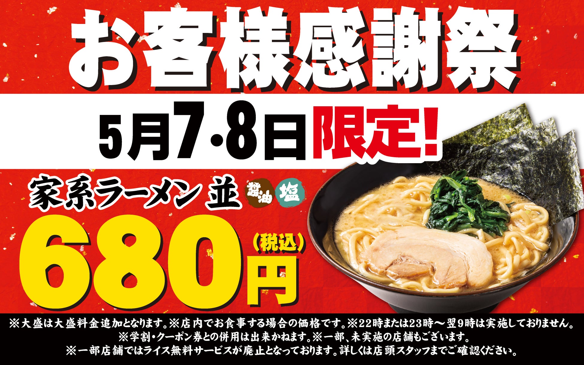 ~2025年5月7日(水)・8日(木)限定で『家系ラーメン並』を税込680円で提供~