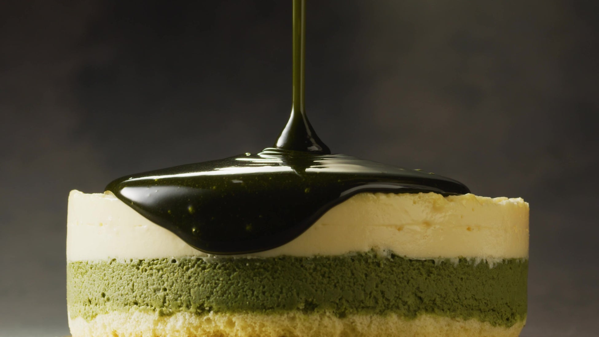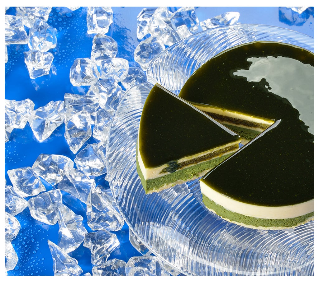 下層は抹茶のベイクドチーズケーキ。上層はレアチーズのムース。表面には抹茶のナパージュをかけ濃い抹茶の苦みを感じるチーズケーキです。