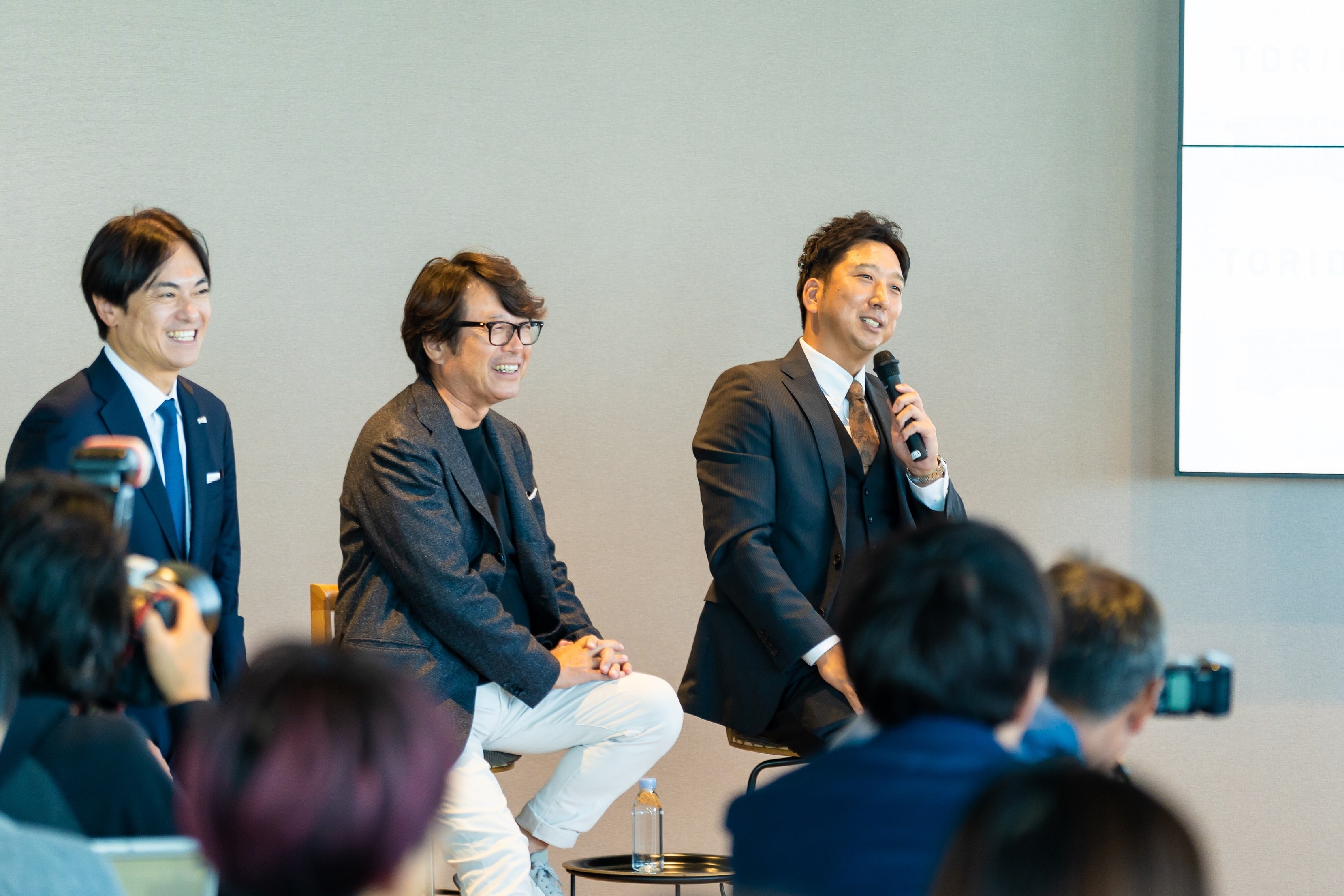 (左から)四国アイランドリーグ plus 代表取締役社長 馬郡 健氏、トリドールHD 代表取締役社長 兼 CEO 粟田 貴也、藤川 球児氏