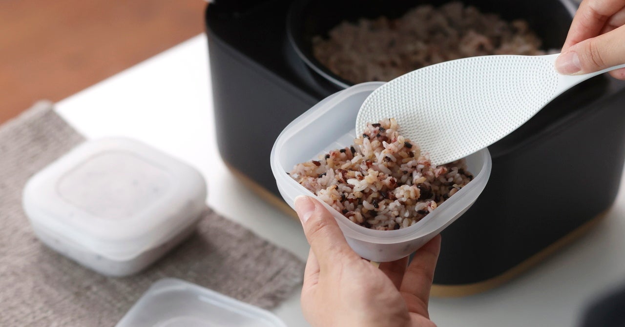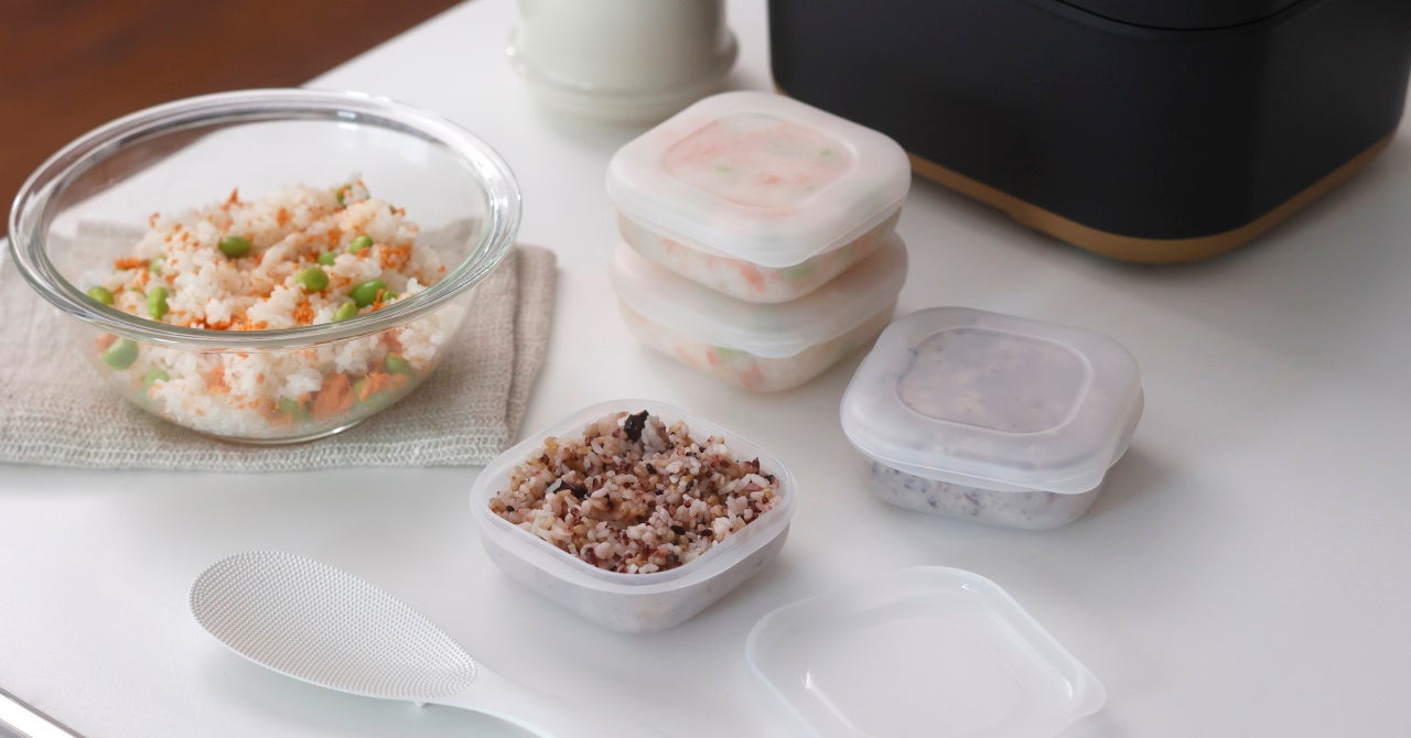 「極 冷凍ごはん容器」は、ご飯1膳分(約180g)の冷凍保存用の容器です。炊いたご飯を小分けにして冷凍保存しておく方が多いことから、電子レンジで温めた際のご飯の美味しさにこだわり開発しました。底にセットした「すのこパーツ」の上にご飯を入れるため、温めた際にはスリットから余分な水分が下に落ちて、容器の底のご飯のベタつきを防ぎます。また、薄く角を丸みのある形状にすることで、ムラなくふっくらとご飯を温められるようにしました。角が丸い形状により、ご飯を入れやすく、洗いやすい点も特長です。