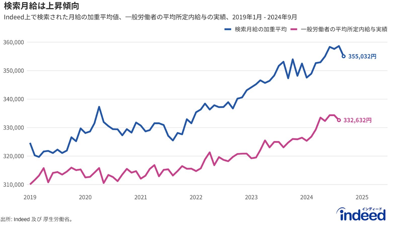 Indeed上で検索される月給額(検索月給)は、2021年9月から2024年9月にかけて、平均328,123円から355,032円と8.2%(26,909円)上昇。