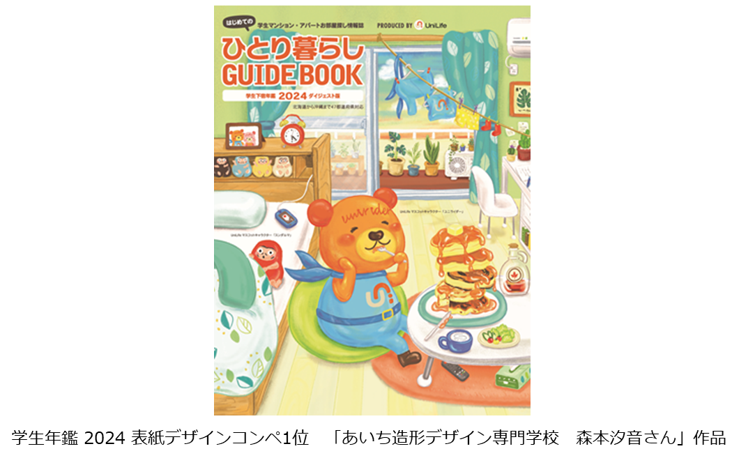 学生下宿年鑑シリーズは、学生マンションを始め、アパート、学生会館、家具家電付き、食事付き、セキュリティ重視、女子学生専用などニーズに即した学生の住まい紹介に特化した受験生・大学生・専門学生向けの『お部屋探し情報誌』です。1985年の初版発行以来38年にわたり、学生の皆様、その親御様、学校関係者様に「安全で快適な理想の住まい」をご案内してきました。1位の作品は、「学生下宿年鑑2024ダイジェスト版 ひとり暮らしGUIDE BOOK」(11月13日発行予定)の表紙デザインに採用されます。本誌は全国の高校や当社グループのお部屋紹介店舗(UniLife)に設置され、毎年、多くの学生や保護者の方が手にします。