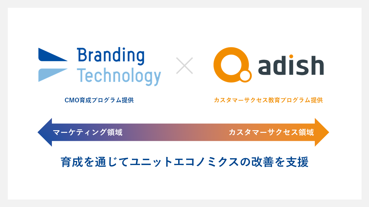 ブランディングテクノロジーが提供するCMO育成サービスとアディッシュのカスタマーサクセス育成プログラムを、両社が相互に取り扱うことで、マーケティング部門とカスタマーサクセス部門の協働に関する課題解決に取り組んでいきます。