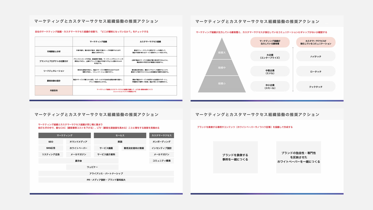 ブランド目標を達成するための重要な要素であるマーケティング組織とカスタマーサクセス組織の協働について、基本となる考え方やアクションプランついて解説します。
