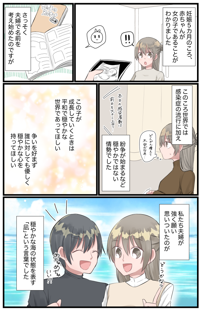 この子が成長していく世界は「平和で穏やかな世界であってほしい。そして、争いを好まず、誰に対してもやさしくできる穏やかな心を持った子になってほしい」。そんなときに思い浮かんだ言葉が「凪」でした。凪とは風が止まり、波が穏やかになるという、海の状態を表す言葉です。