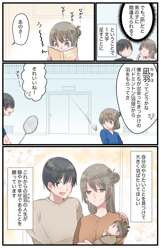 そして、私たち夫婦の出会いのきっかけであるバドミントン(羽球)から「羽」という漢字をもらって「凪羽(なぎは)」という名前に。