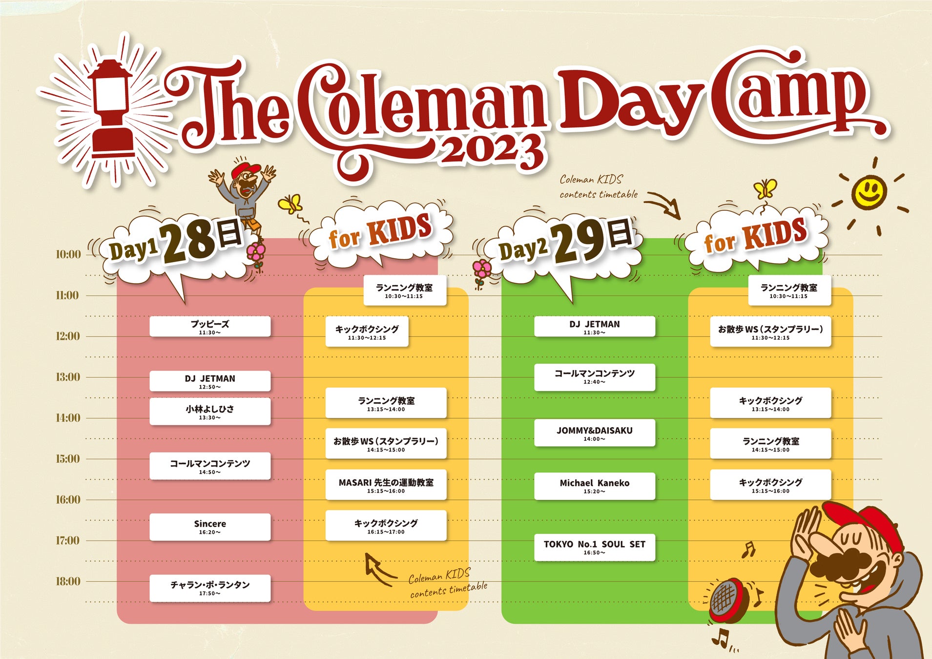 「アナログだけど特別な時間」をコンセプトにデイイベントの「The Coleman Day Camp 2023」は、キャンプやアウトドアに興味があっても、なかなか一歩を踏み出せない方々へ、都会でアウトドアの雰囲気を味わえるイベントとなっています。入場料は無料で、アウトドアの良さを知ってもらうためのワークショップ(一部有料)やステージイベントを予定しています。