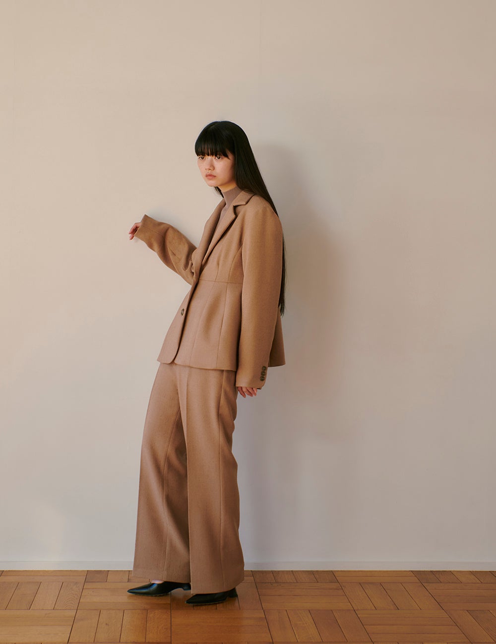 Tweed peplum jacket (brown) ¥35,200 / Tweed center press pants (brown) ¥20,900