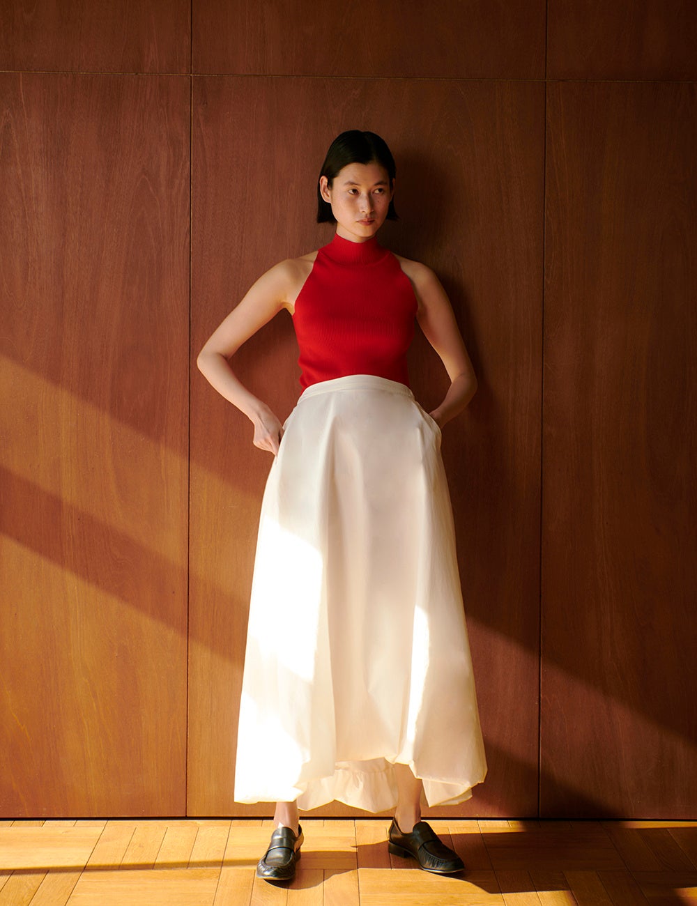 Halter neck knit (red) ¥7,700 / Balloon volume skirt (white) ¥14,300