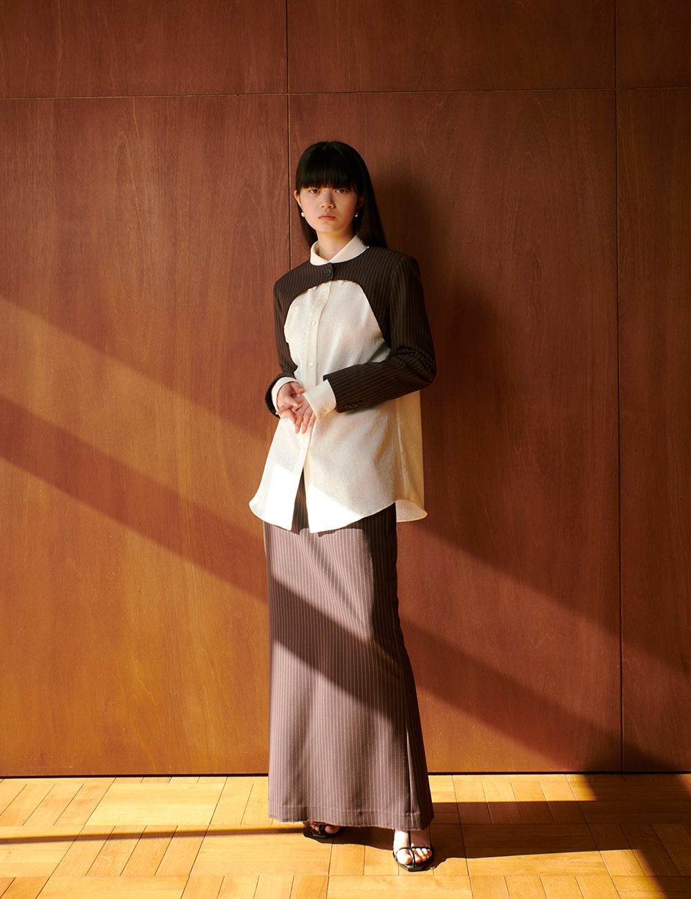 Stripe sleeve jacket (brown) ¥17,600 / Flower jacquard shirt (white) ¥19,800 / Stripe slit long skirt (brown) ¥15,400