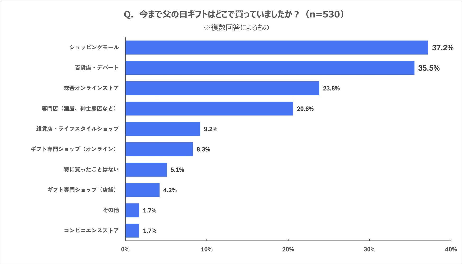 「今まで父の日ギフトをどこで買っていましたか?」という問いに対しては、「ショッピングモール(37.2%)」が最多、次いで「百貨店・デパート(35.5%)」「総合オンラインストア(23.8%)」という回答結果となりました。